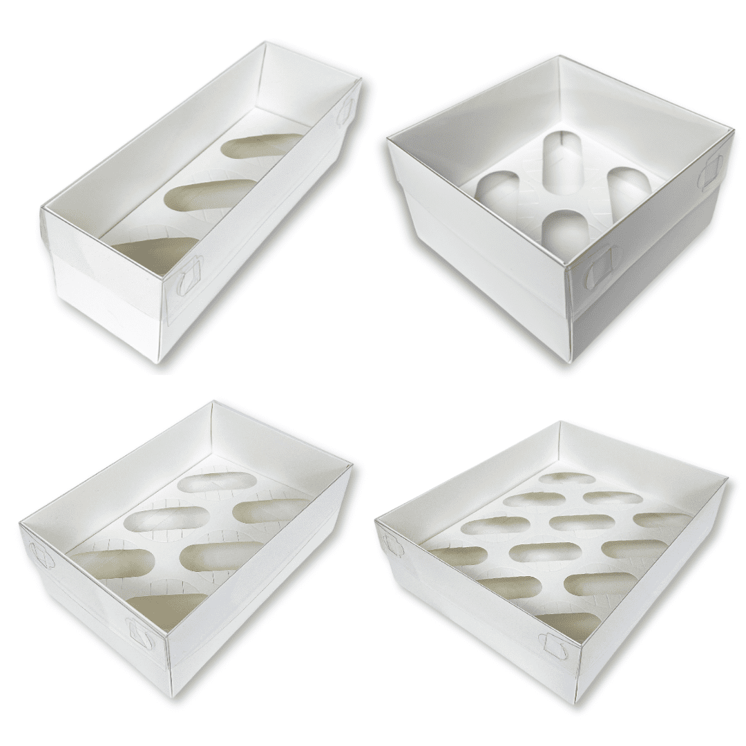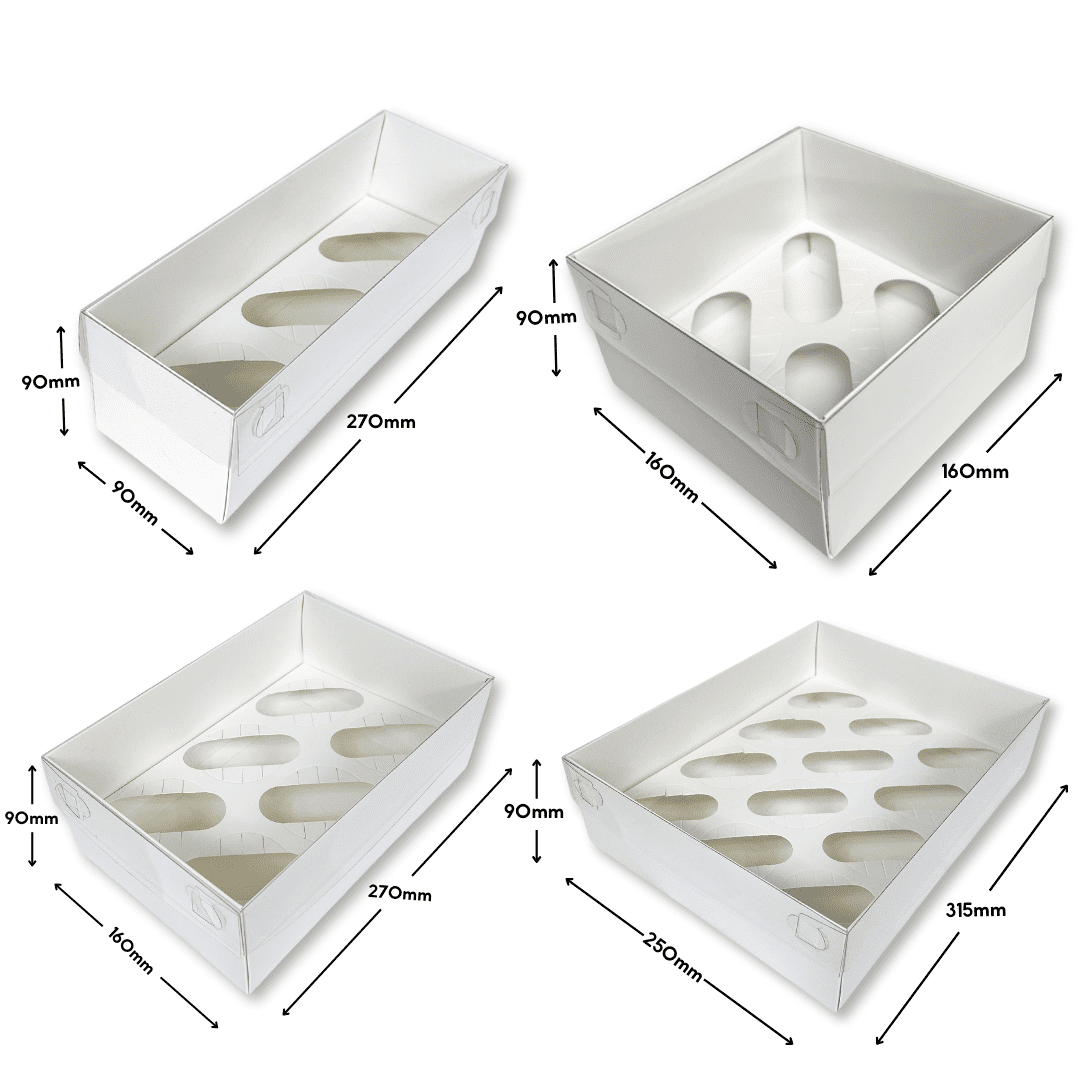 Try each size of our popular extra-tall cupcake boxes with our mixed-size variety bundle, and make sure you're ready to take on cupcake orders of all quantities! This bundle contains a pack of 5 x 3-hole, 4-hole, 6-hole and 12-hole cupcake boxes (90mm tall) - that's a total of 20 cupcake boxes included in this value-bundle!