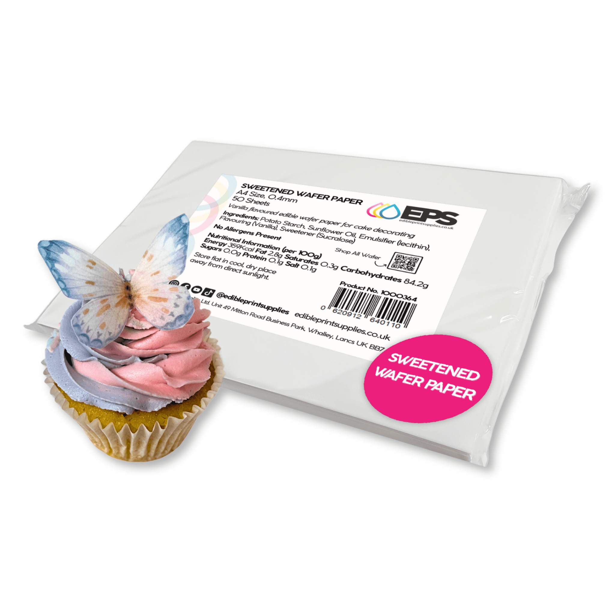 This vanilla-flavoured wafer paper is a sweetened version of our best-selling EPS Wafer Paper, offering the same premium quality and brilliant print finish with an added hint of sweetness. Designed for use with edible printers and inks, it’s ideal for creating cake toppers, cupcake toppers, and edible decorations with extra flavour. EPS Sweetened Wafer Paper can also be used for wafer flowers, edible labels, or the viral burn-away cake trend.